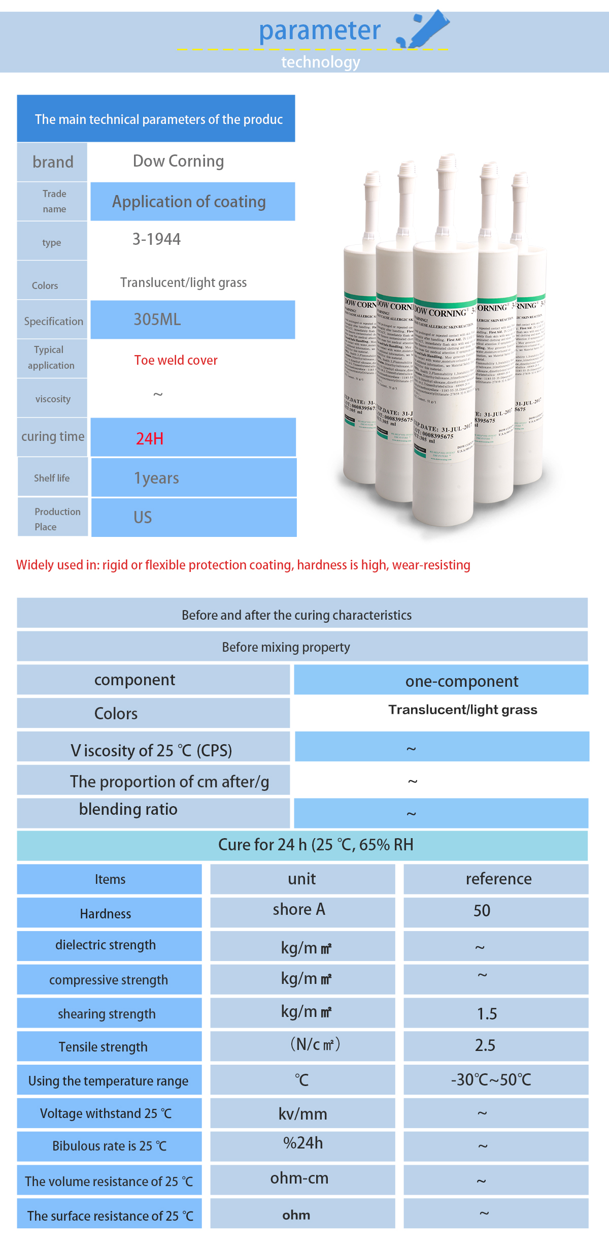 Dow corning 3-1944 HP rigid and flexible printed circuit board device and electronic devices used for the protection of the coating, and coating and sealing used in the bad environment in a variety of ceramics, hybrid circuits, components and connectors of ideal material, in order to provide excellent pointed foot/welding points covered.