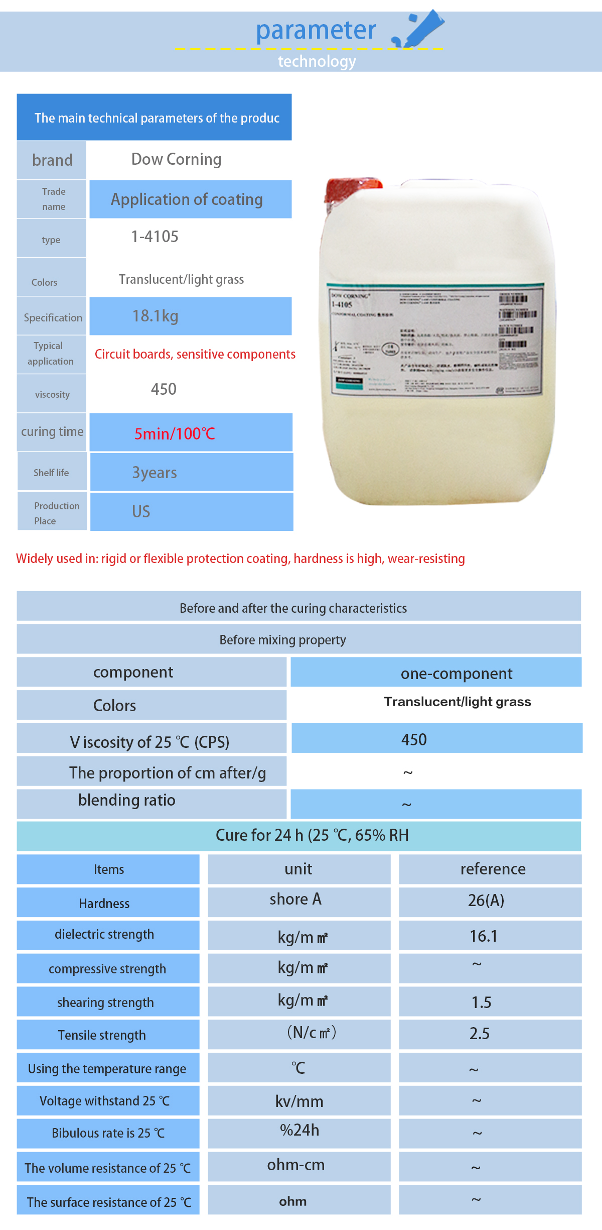 Dow corning 1-4105 is a two-component, transparent without solvent rubber, thermal curing rapidly, low viscosity and low temperature fast curing, heat curing one-component, transparent coating, solvent-free elastomer, rapid heating solidifying, transparent, resist the influence of humidity and other bad environment;