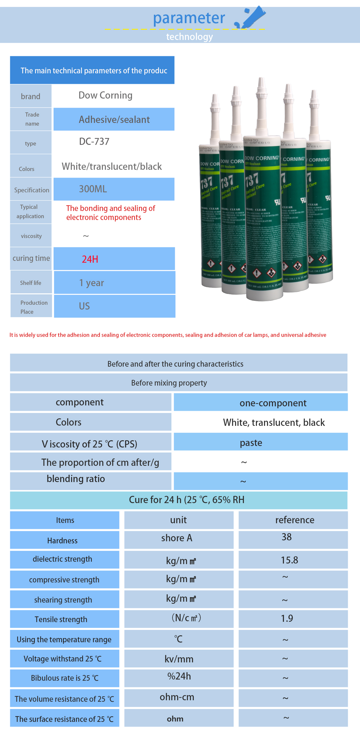 The tao corning 737 does not need to be coated directly with a variety of materials, deoxime is solid, not react with metal or plastic, solidify rapidly, the working temperature range is wide.