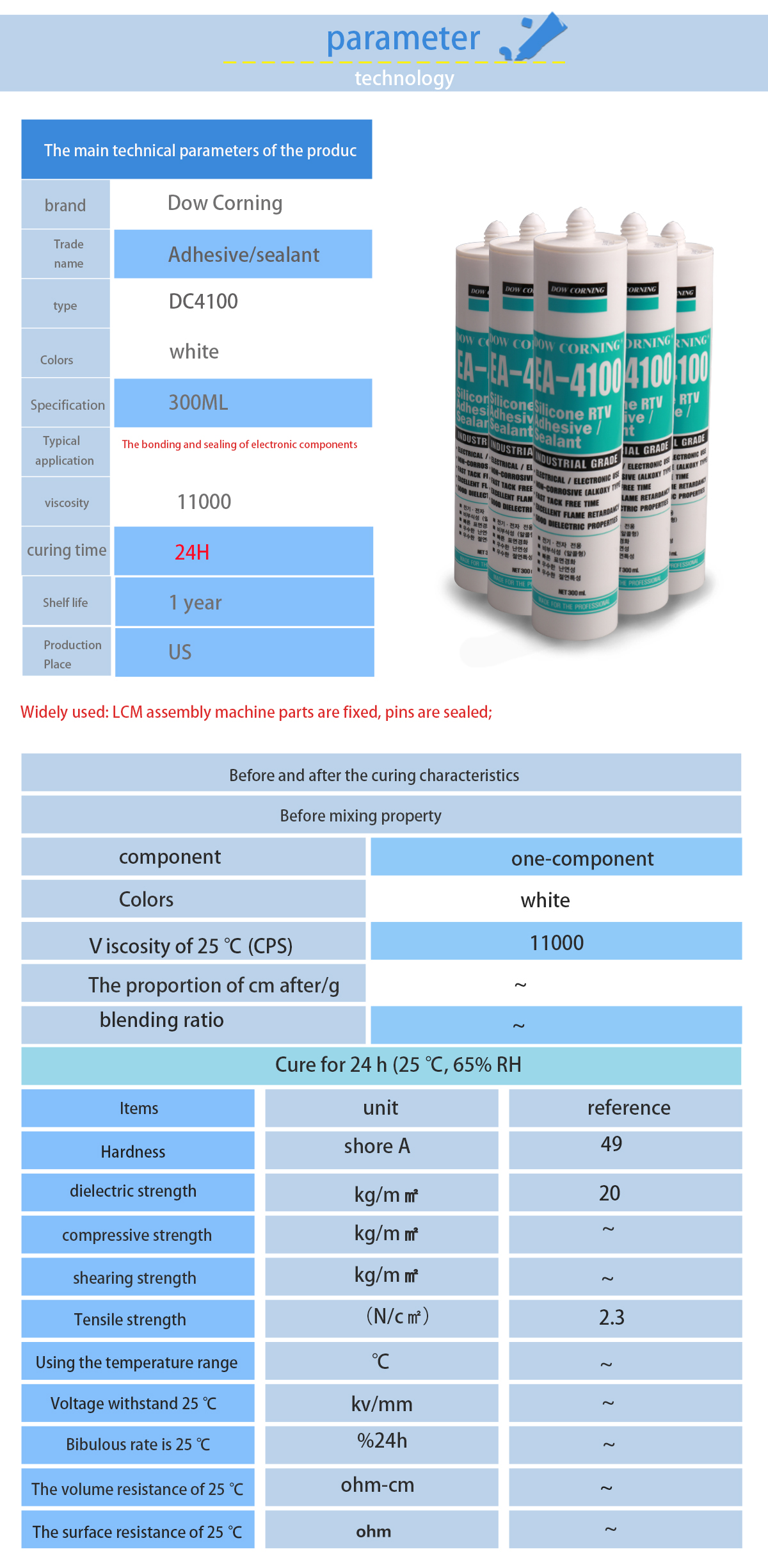 Dow corning EA - 4100 electronic glue is widely used in electric iron, electric cooker, electric fryer, heat pipes, high temperature air filter of high temperature, high temperature oven, high temperature pipeline product adhesive sealing, etc.